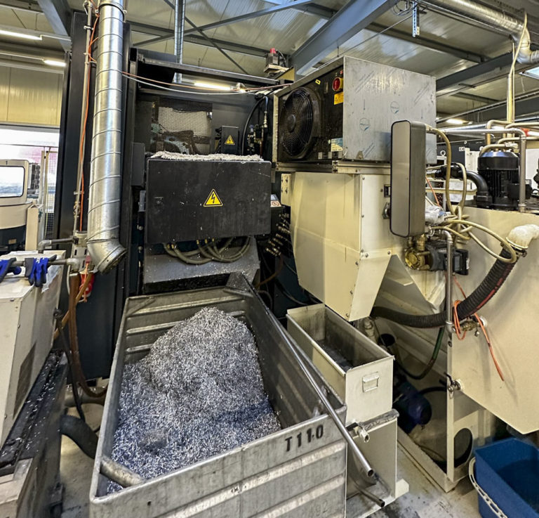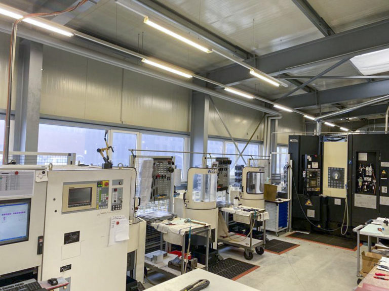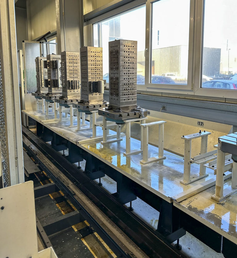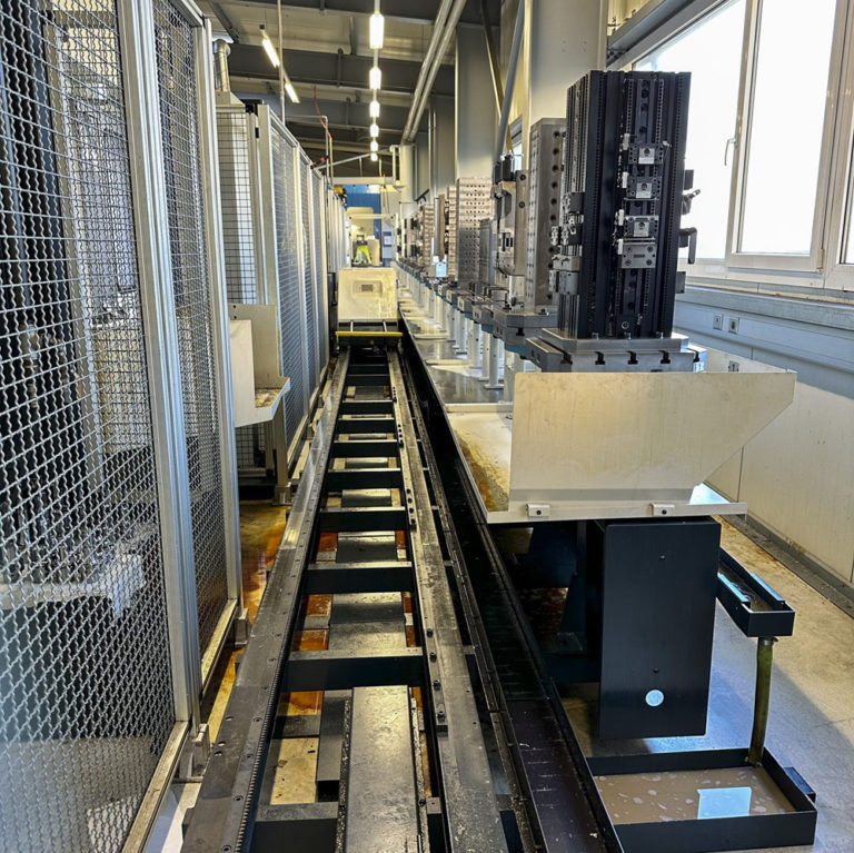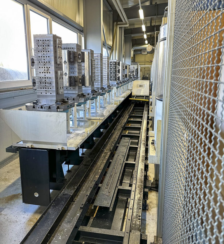 The system has three loading stations and two connections for machine tools (MAKINO A55 + A55e)
